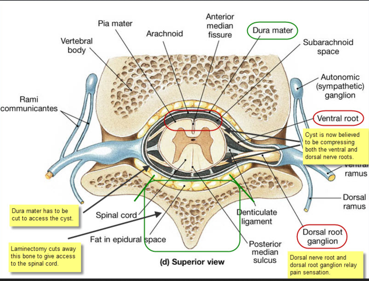 This is because the cord itself has to be pushed hard over to one side to enable access to a ventral cyst when the surgeon has entered the spinal column from behind.