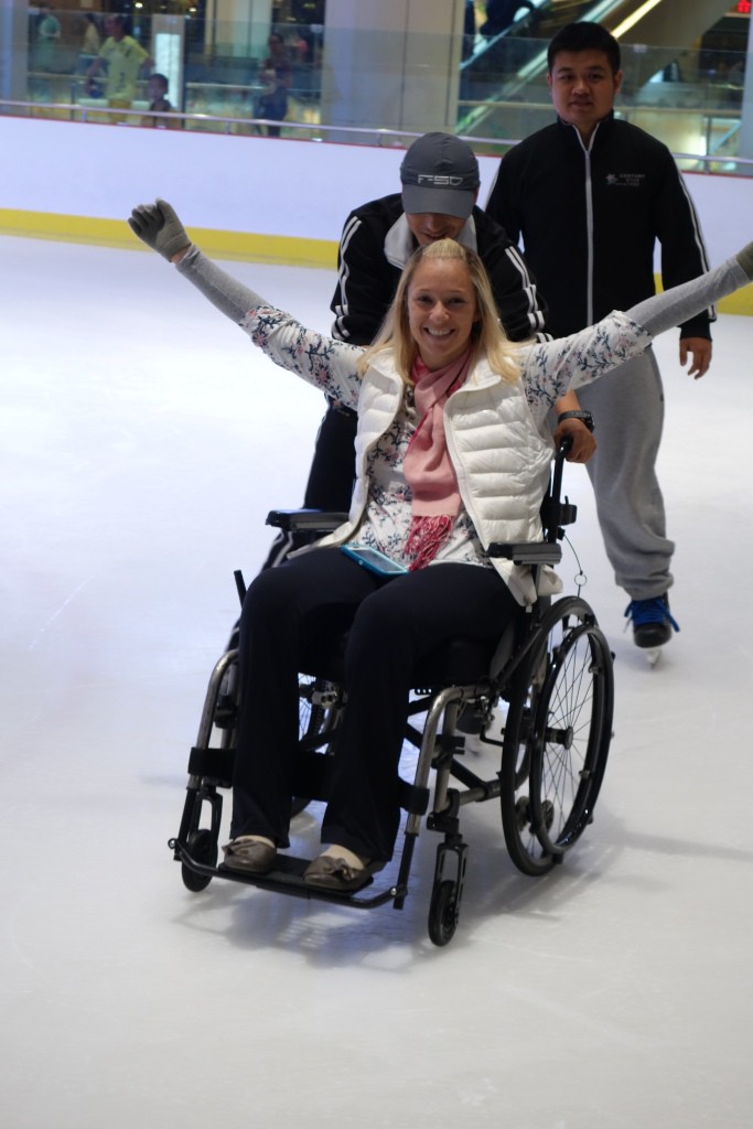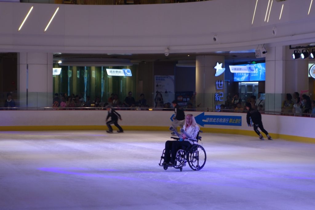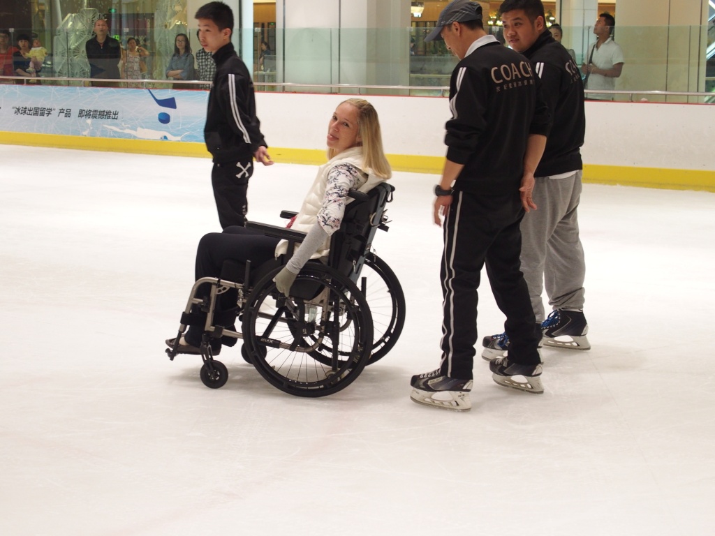 I also spent my last weekend in Kunming going ice skating… Yes you heard me right! There is an ice skating rink on the fifth floor of this very large mall and at first the staff did not want to let me put my wheelchair on the ice and skate or rather be pushed around the ice.