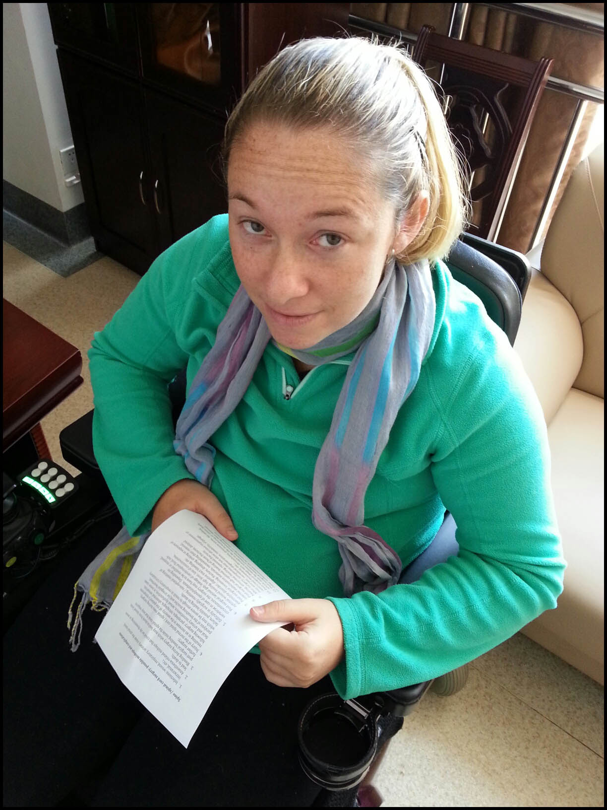 Ali started her day (a beautiful, high pressure spring day here in Kunming) by participating in a meeting held in Dr. Zhu Hui’s office at the Tongren Hospital. Attending, in addition to Dr. Zhu Hui and Ali, were chief neurosurgeon Dr. Liu, Ali’s mother Uschi, her brother Mattias, her father Ralph, and two other members of the neurosurgery team and the chief nurse. Also in attendance by teleconference from Indianapolis was Indiana University Professor Dr. Xiao-Ming Xu, who has played a mission-critical role even well before Ali’s arrival in Kunming.