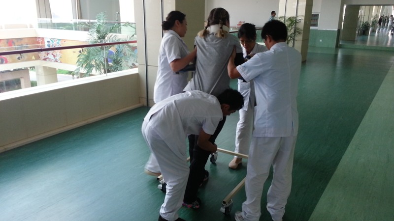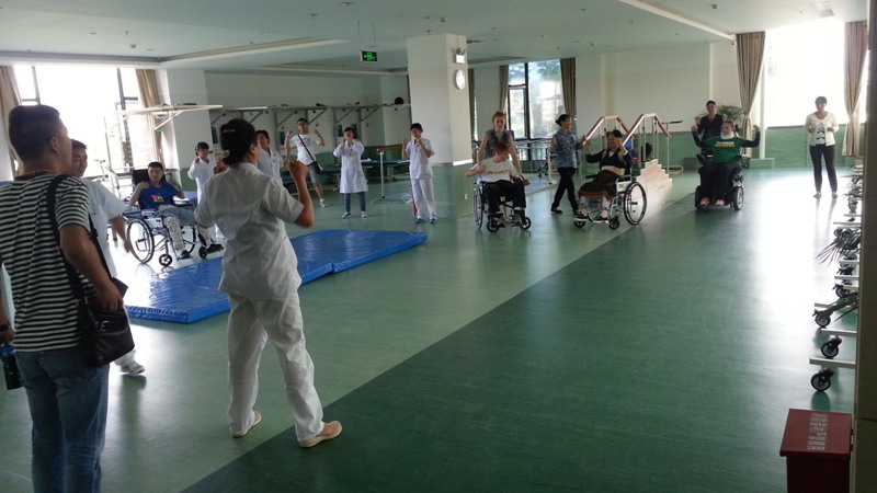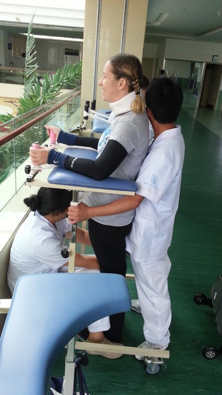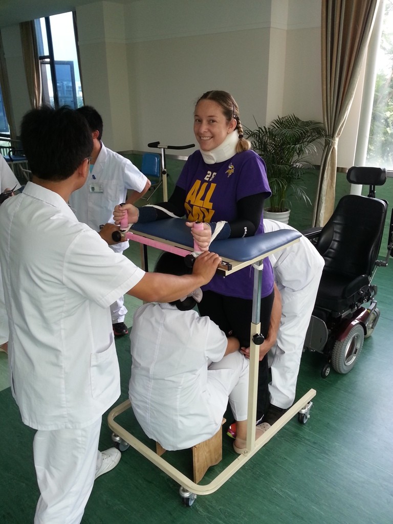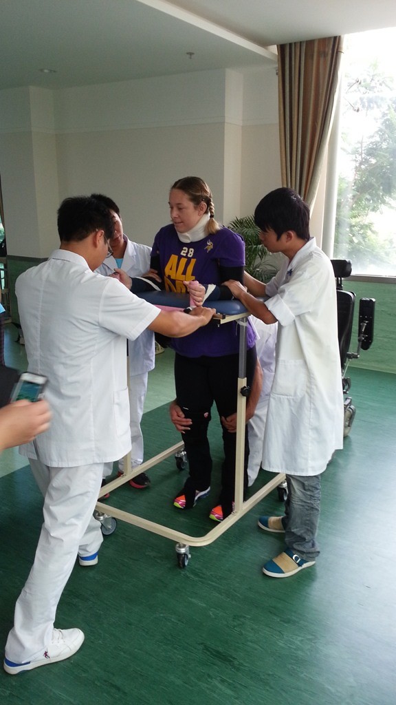 Once I start walking, there is one therapist behind me pushing my legs to walk, 2 therapists positioned either side helping me hold up my upper body, and one physical therapist in the front of the walking frame so it does not roll away from me.