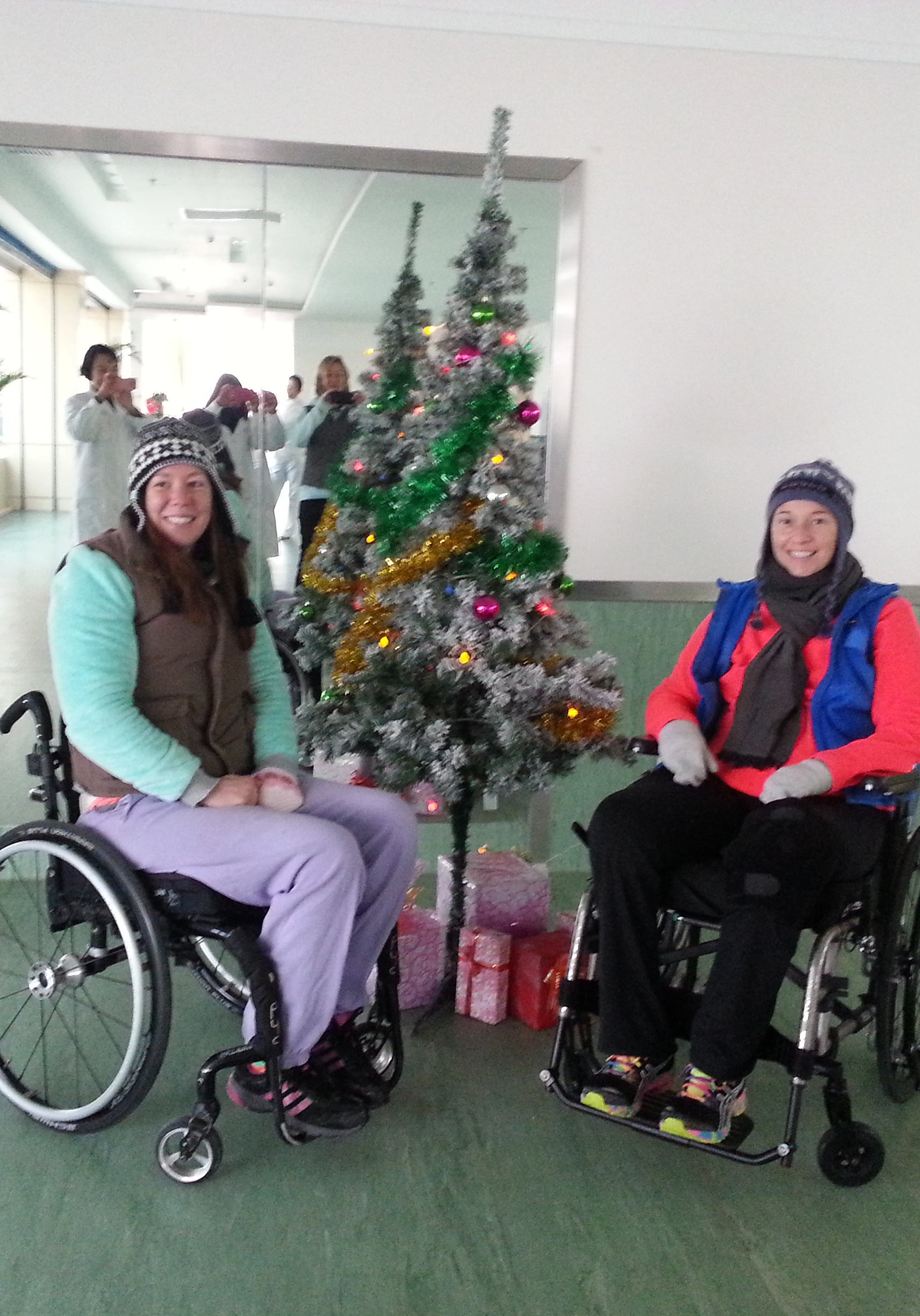 Closer to base, Dr. Zhu and the hospital staff made a commendable effort at decorating the gym with a little Christmas tree and presents underneath. Suzanne Edwards and I were the lucky models to pose for the picture.