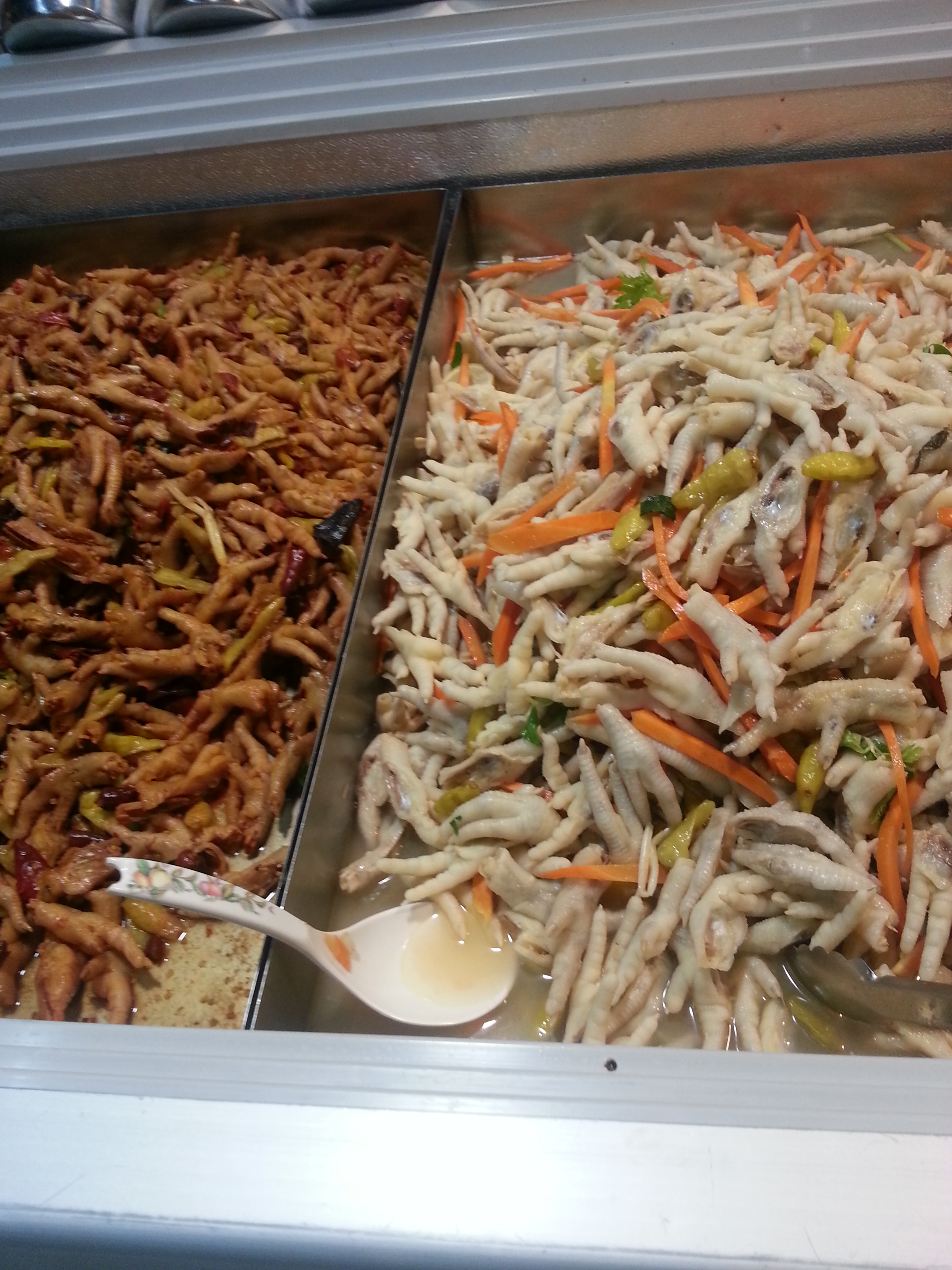 Chicken feet anybody? Just like you would have macaroni salad at the salad bar at whole foods, chicken feet are on offer at the Chinese supermarket!