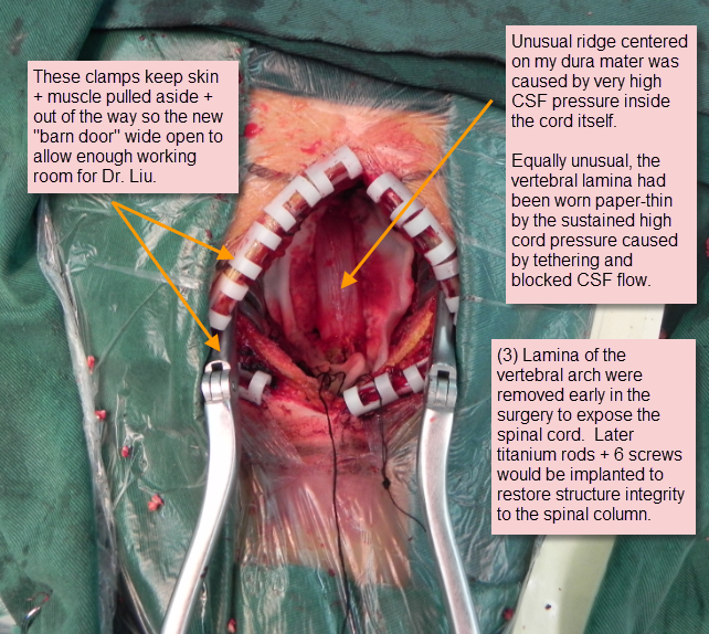 Anyway, the objective here is to reach the fluid-filled cyst on the anterior (front) side of my spinal cord in order to cut it open and drain the fluid, thereby decompressing my spinal cord.
