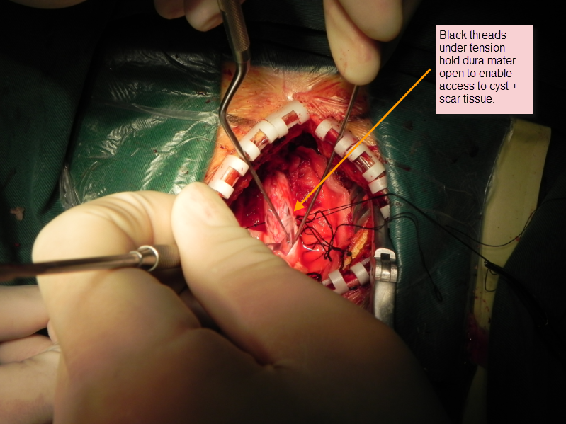 The dura mater is now wide open, exposing the pia mater in order to gain access to the arachnoid cyst on the anterior side of the pia mater, and also revealing 2 small syrinx cysts just inside of the pia mater that were successfully drained.